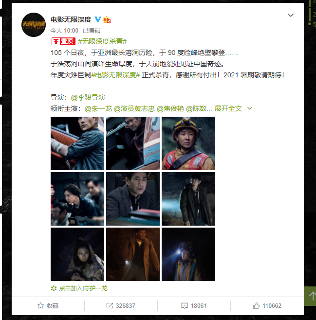 从官微中得到了三个重要信息,第一就是历时三个月,这部剧终于杀青了,第二点就是在今年的暑期档,就要在大荧幕上见到龙哥了!第三点,从“亚洲最长溶洞”“90度险峰绝壁”,这些拍摄场景来看,这绝对是值得一看的电影!